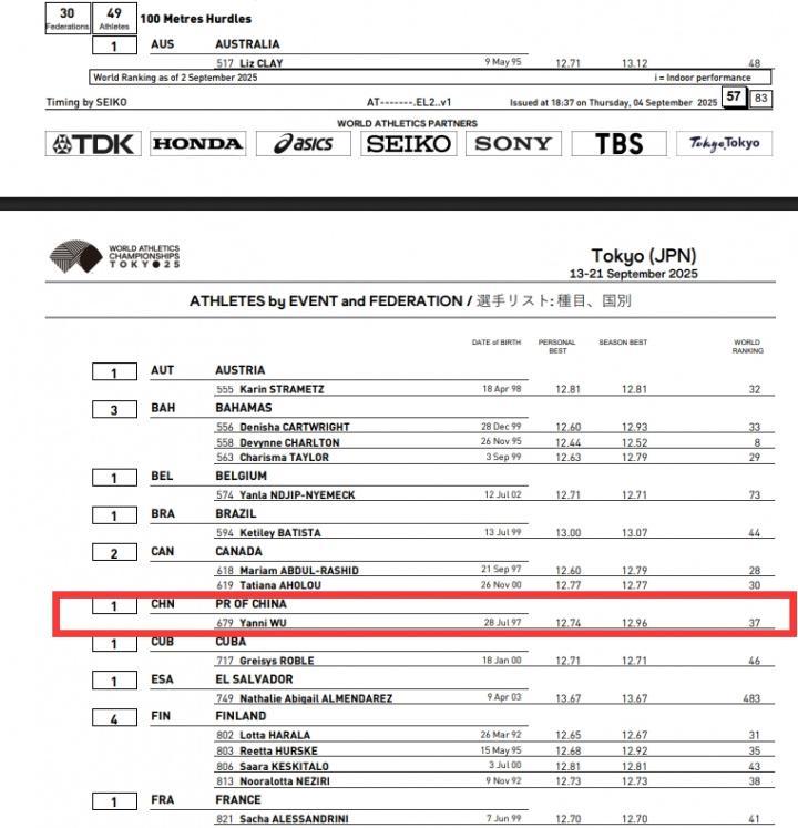 直播吧09月06日讯 世界田联公布2025年东京世界田径锦标赛参赛名单,吴艳妮以世界第37的排名入围!她将代表中国参加女子100米栏。